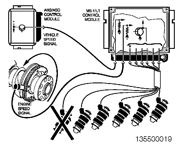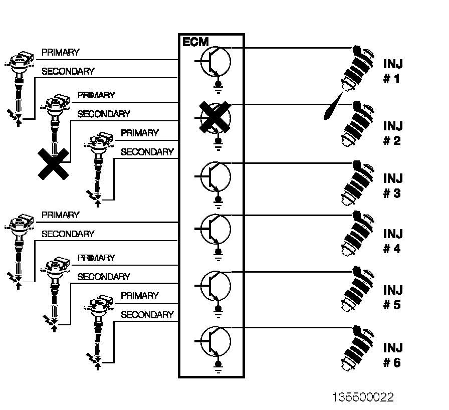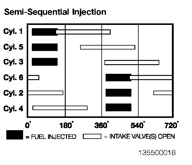The Camshaft Position (Cylinder ID) affects the injection timing (SemiSequential/Full Sequential). To accomplish this, the ECM contains six Final Stage output transistors that activate the injectors individually. The engine operates sufficiently on SemiSequential Injection (two groups of three), but more efficiently on Full Sequential Injection (six individual). If one of the fuel injector circuits faulted, the engine can still operate on limited power from the other remaining fuel injector circuits.