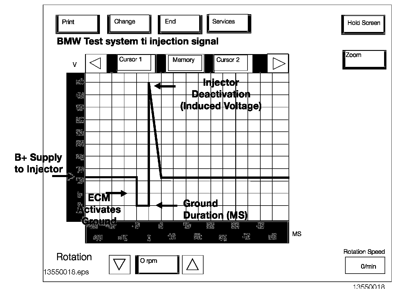 ^ ECM Final Stage transistor activation. This test functions is found under the oscilloscope Preset list "Ti Injection Signal". Install the Universal Adapters Diagnostic cable MFK 2 negative lead to ECM ground and MFK 2 positive lead to the ground activation circuit for the injector. This test is performed with the engine cranking or running.