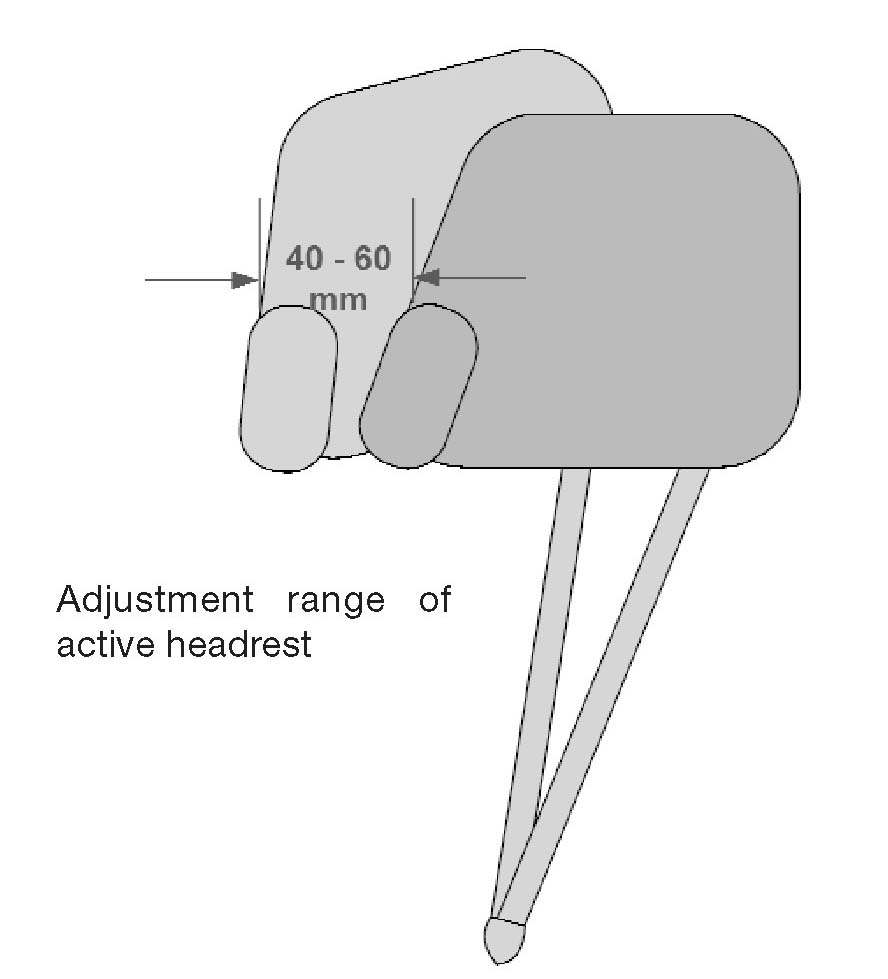 Depending on the vertical adjustment of the headrest, different adjusting paths result. The adjustment of the headrest, measured on the cushion, is approximately 40 mm when the headrest is retracted. When the headrest is fully extended, the adjustment is approximately 60 mm.