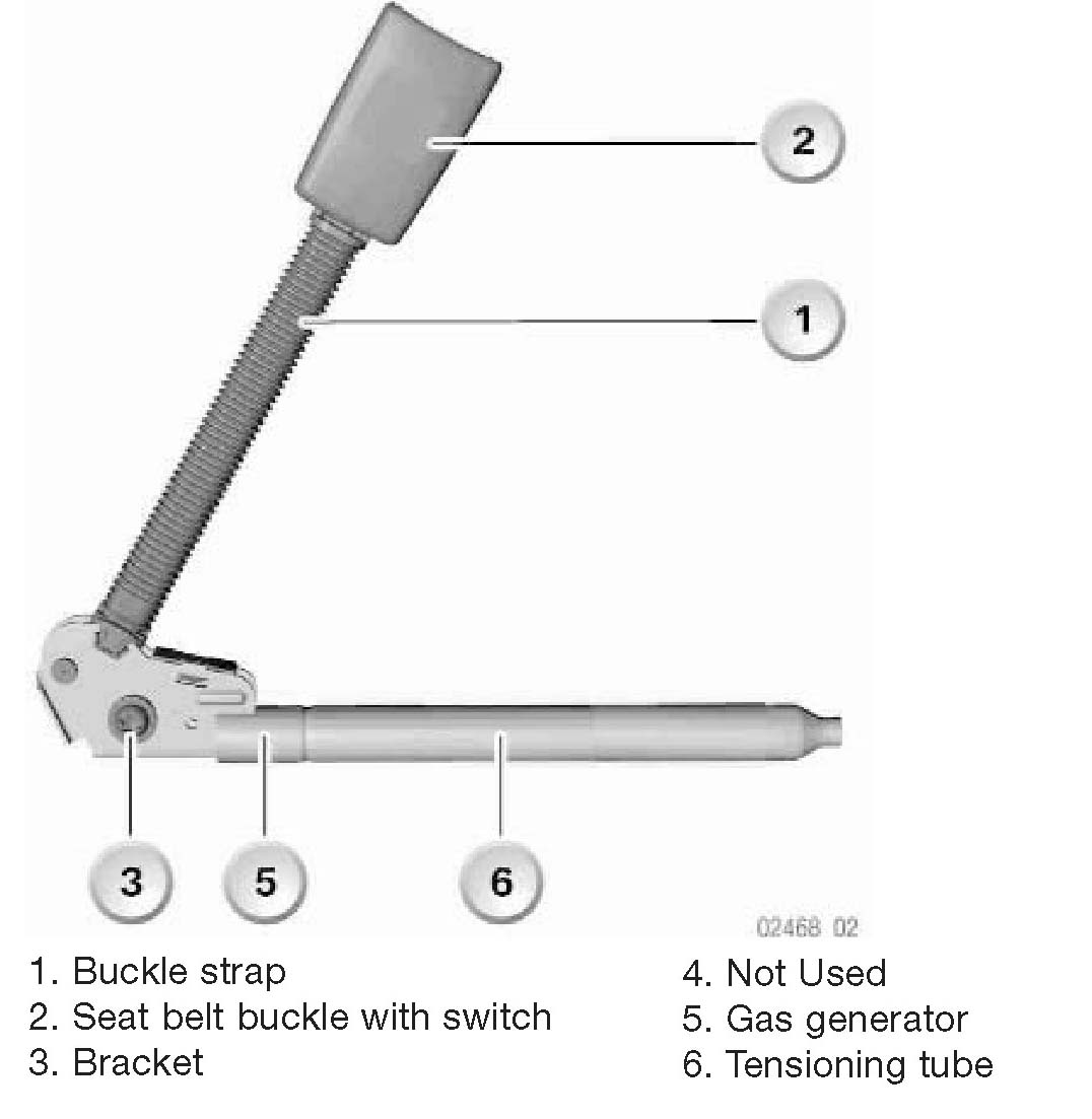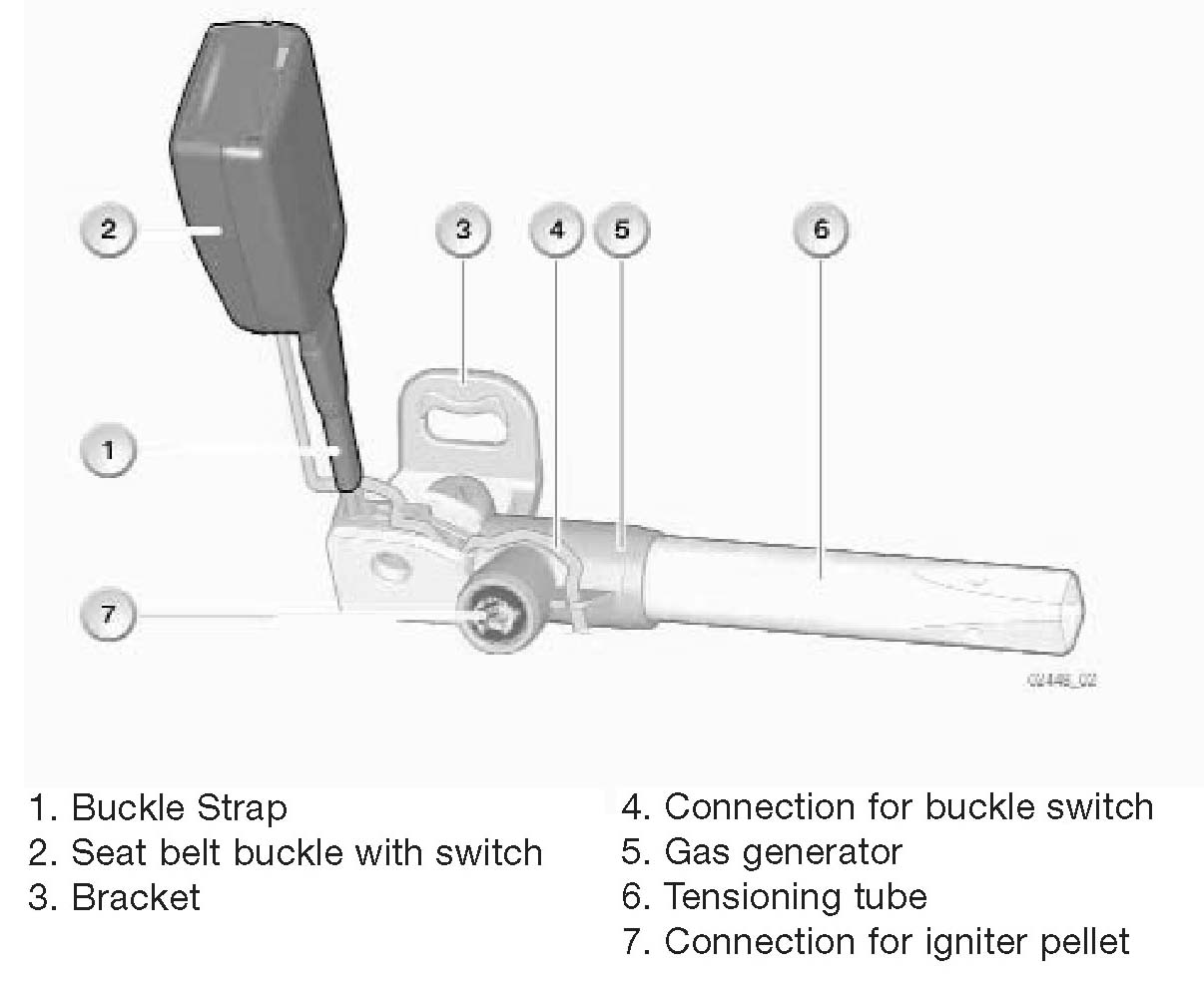Technically, the front and rear seat belt tensioners are identical. The seatbelt tensioners consist of igniter pellet, generator, plunger and operating cable.