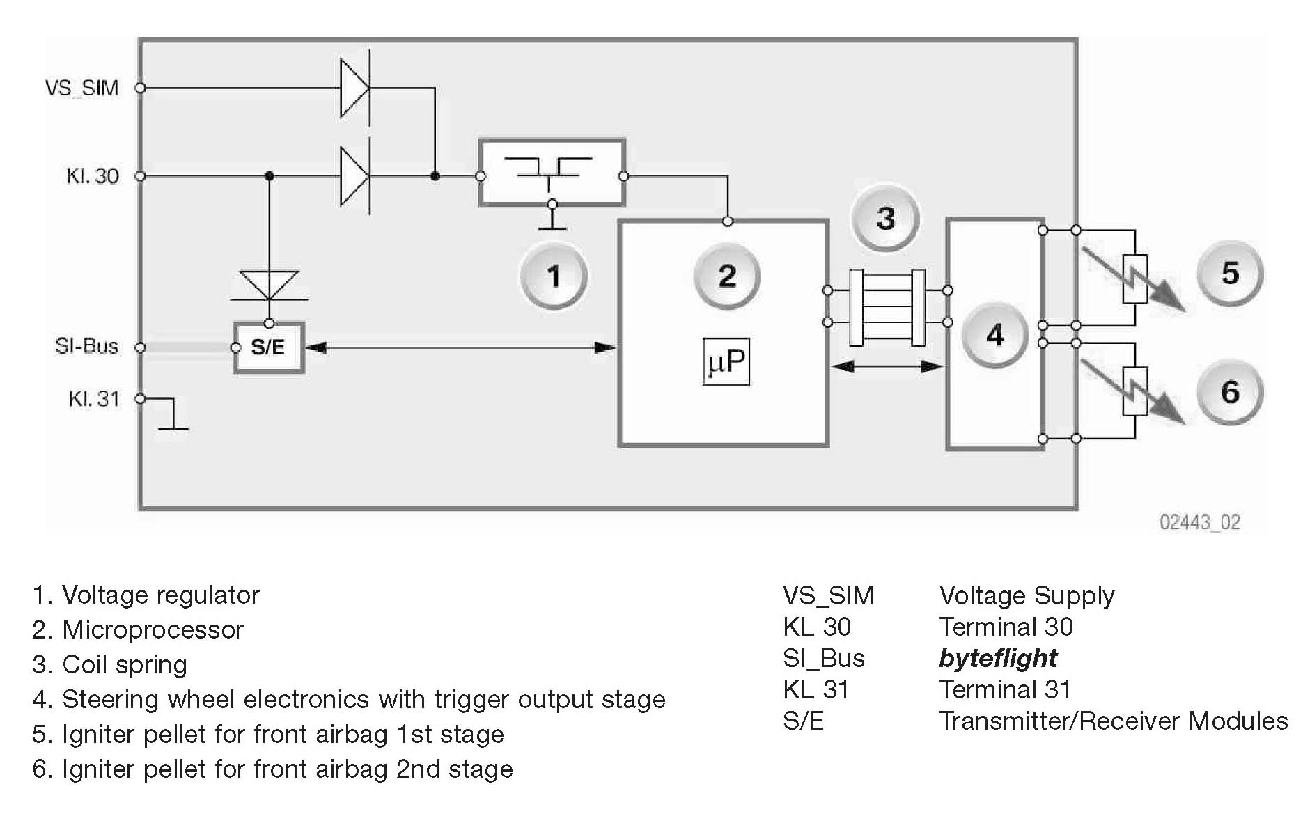 The steering column switch cluster controls and monitors the two trigger circuits for the front airbag on the drivers side.