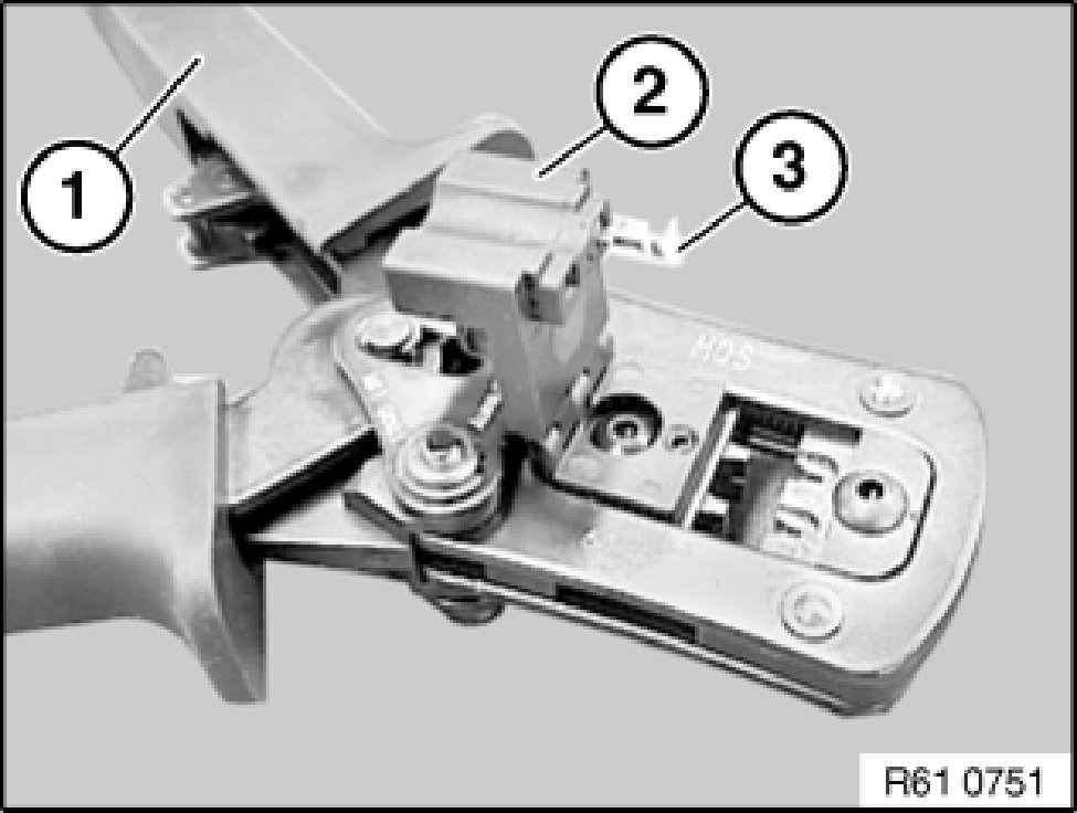 To crimp MQS contacts, use pliers 61 4 321 (1) in conjunction with crimping head 61 4 324 (2) from crimping set 61 4 320.