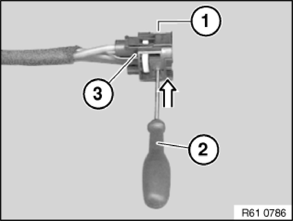 Press lock (1) with suitable tool (2) in direction of arrow out of socket housing (3).