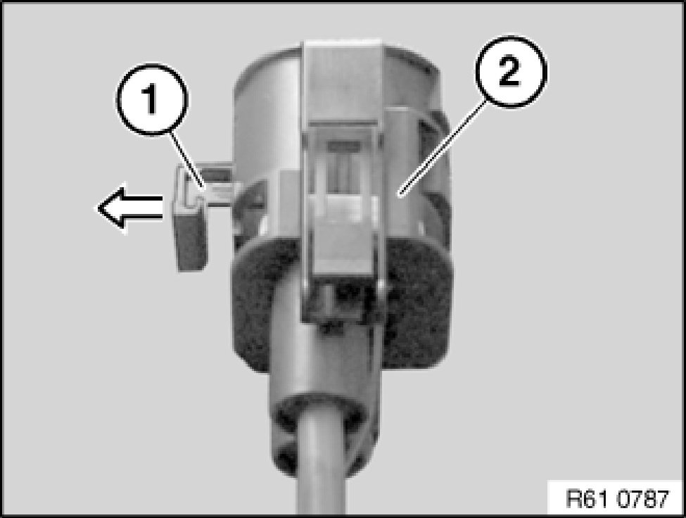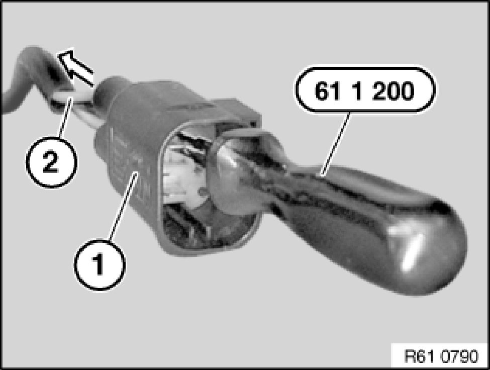 Insert special tool 61 1 200 into socket housing (1) and pull out lead with LCC contact (2) in direction of arrow.