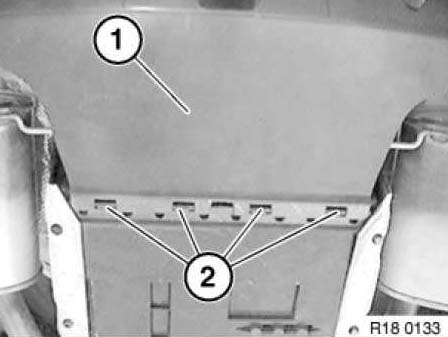 Release screws (1) on rubber mount for rear muffler on rear axle carrier.