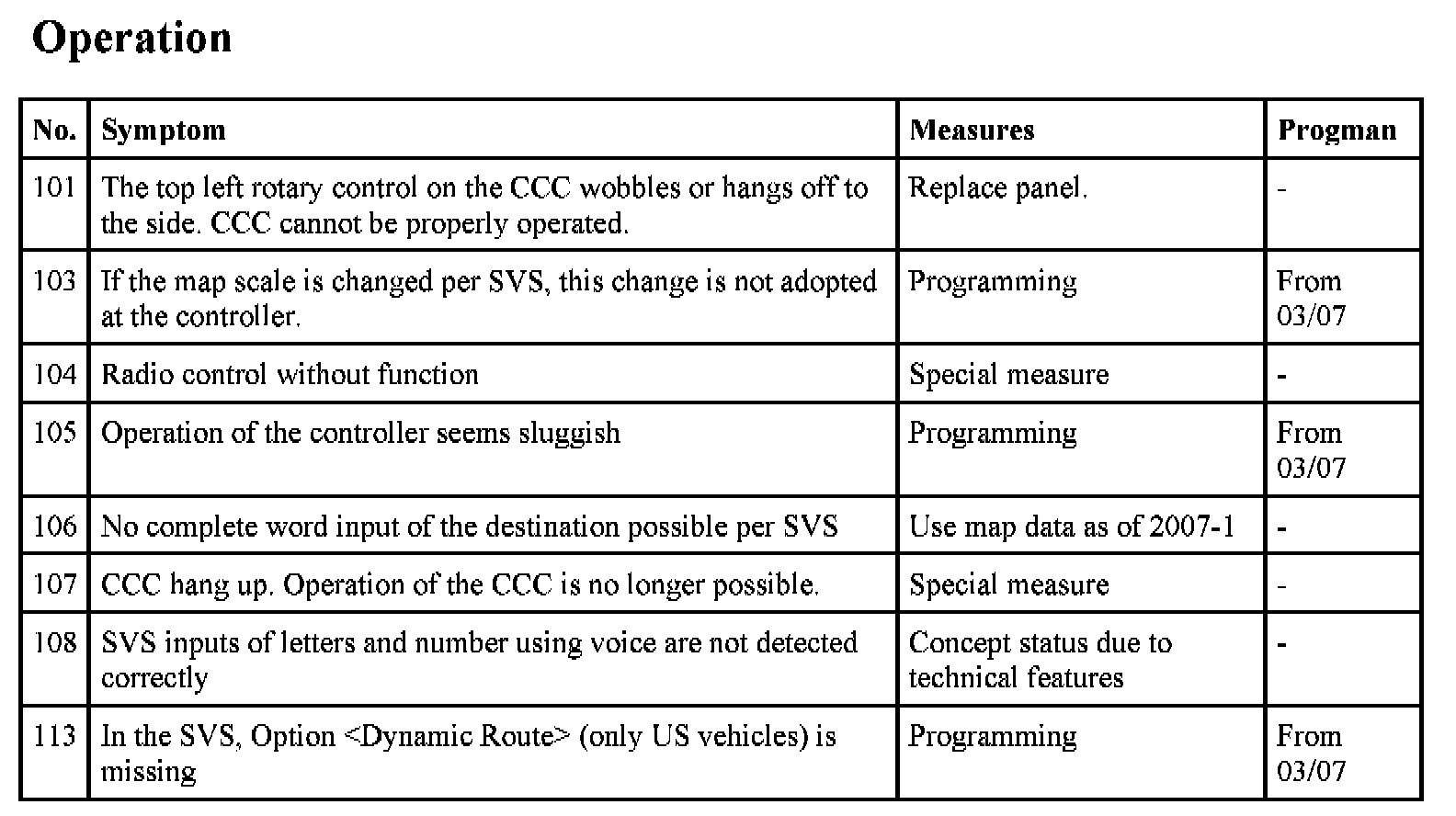 The navigation system Professional (CCC) is a complex control module with a large number of possible fault profiles. The following list shows known symptoms in the functional area CCC audio and navigation. Fault profiles from the functional areas of telephone and Telematic services as well as integrated heating / air conditioner control are not covered in this test module.