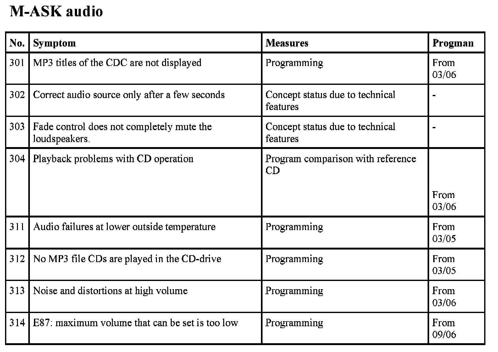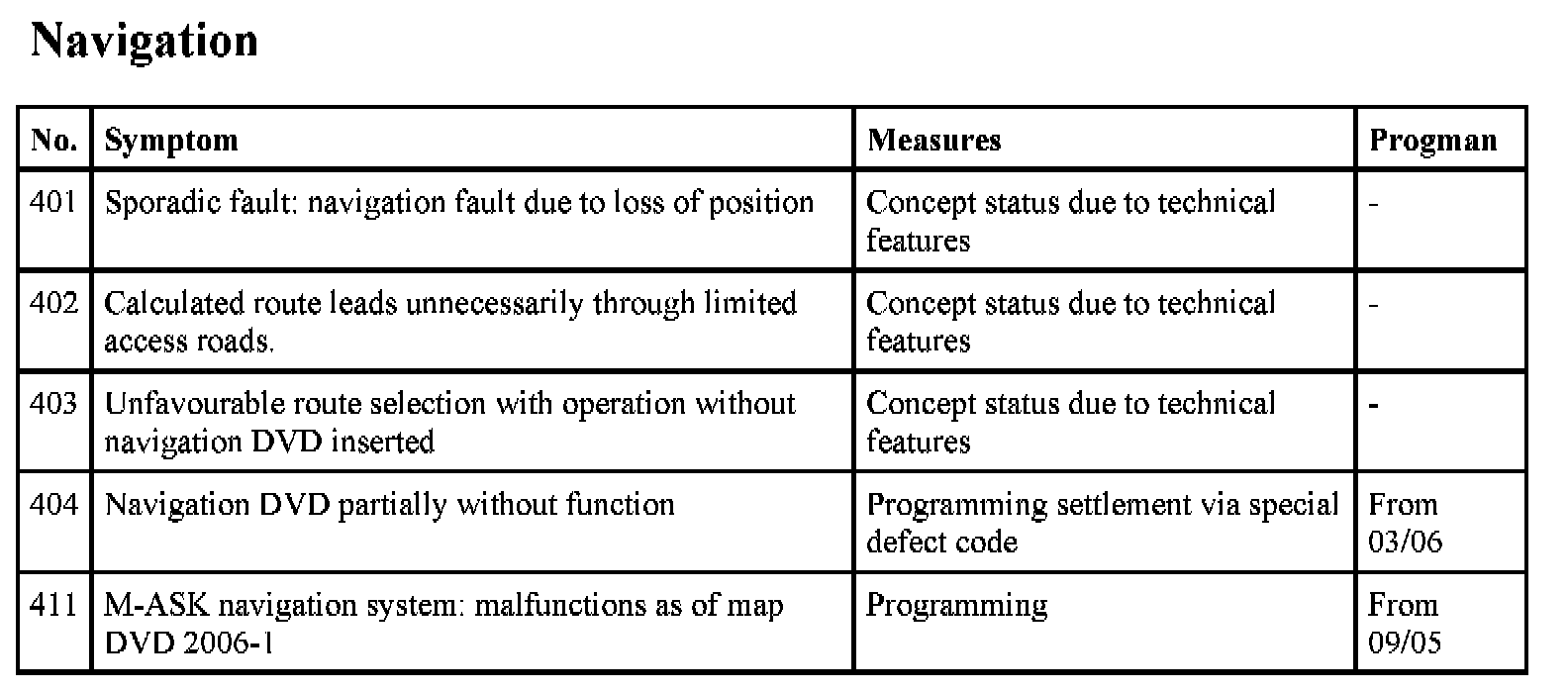 The navigation system Business (M-ASK) is a complex control module with a large number of possible fault profiles. The following list shows known symptoms in the functional area M-ASK audio and navigation. Fault profiles from the functional areas of telephone and Telematic services as well as integrated heating / air conditioner control are not covered in this test module.