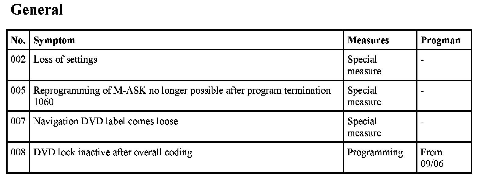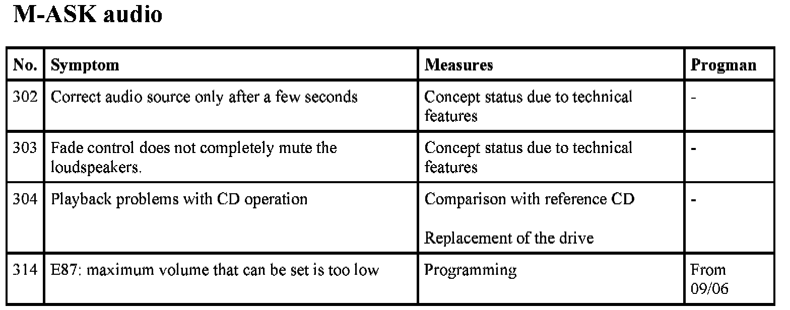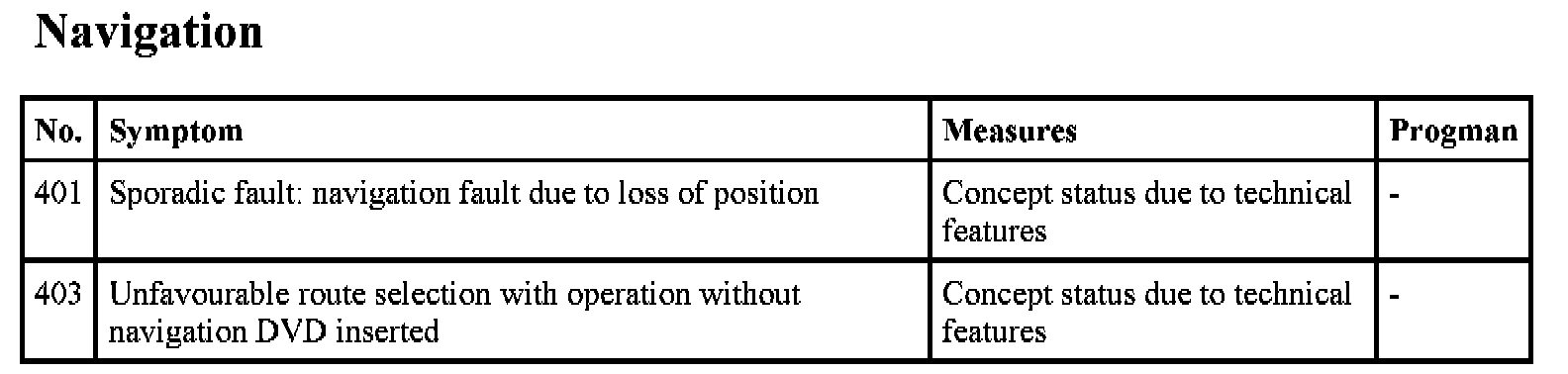 The navigation system Business (M-ASK) is a complex control module with a large number of possible fault profiles. The following list shows known symptoms in the functional area M-ASK audio and navigation. Fault profiles from the functional areas of telephone and Telematic services as well as integrated heating / air conditioner control are not covered in this test module.