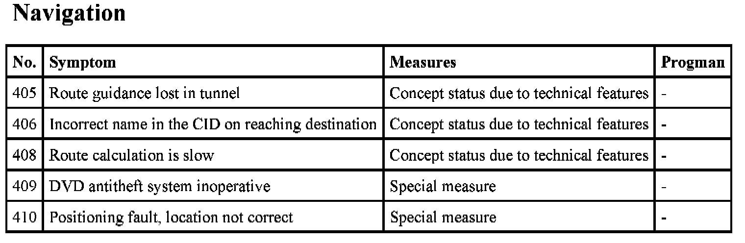 The navigation system Business (M-ASK) is a complex control module with a large number of possible fault profiles. The following list shows known symptoms in the functional area M-ASK audio and navigation. Fault profiles from the functional areas of telephone and Telematic services as well as integrated heating / air conditioner control are not covered in this test module.