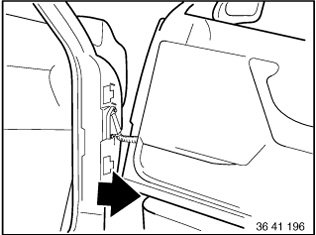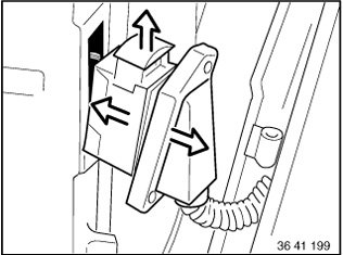 Pull plug connection from door pillar, unlock by pulling out bar and detach.