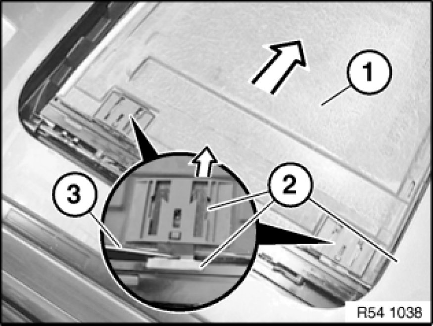 - Press roofliner (1) into opposite guide rail (spring-mounted).