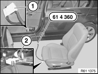 Adapter cable 61 4 360 is connected to vehicle wiring harness (1) and removed seat (2).