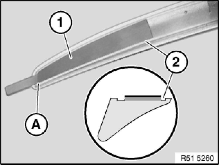 Carefully detach rear spoiler (1) from rear lid with special tool 00 9 318 (assembly wedge) and hot air blower.