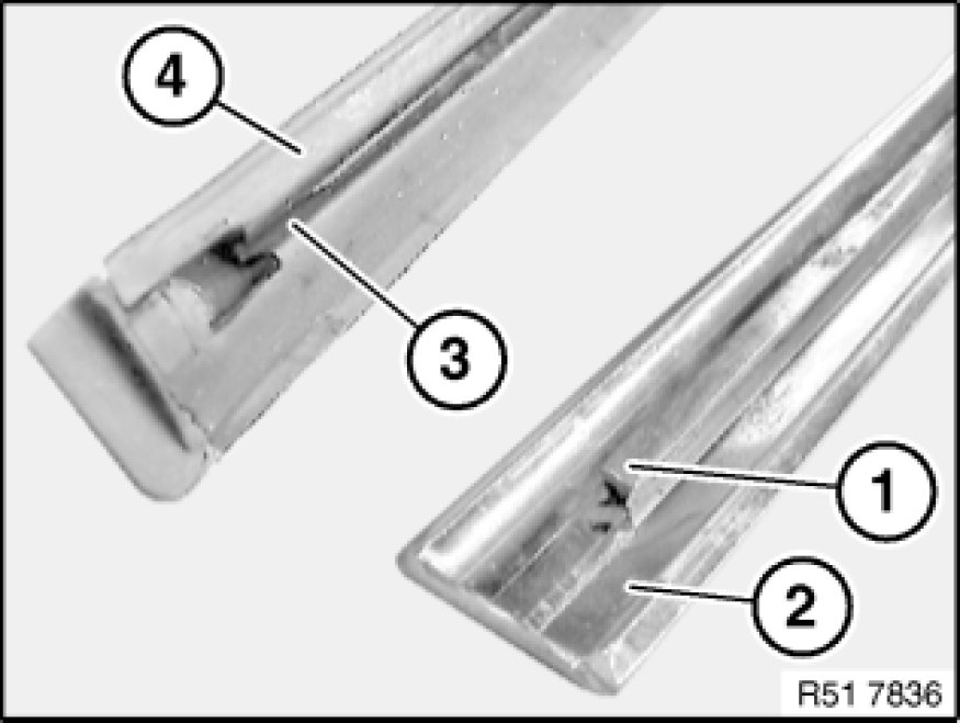 If chrome strip (2) has been pulled out of cover strip (3), both parts must be reassembled.
