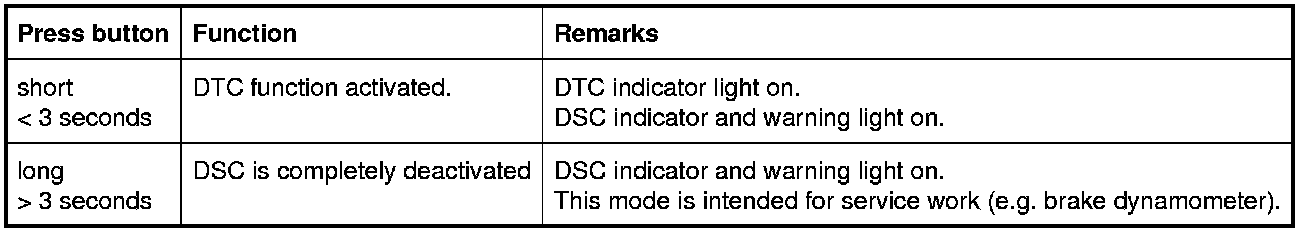 If the DTC button is pressed for longer than 10 seconds (e.g. by a handbag on the centre console), DSC will recognise an operating error. The DSC function remains active and cannot be deactivated until the ignition has been switched off and on again.