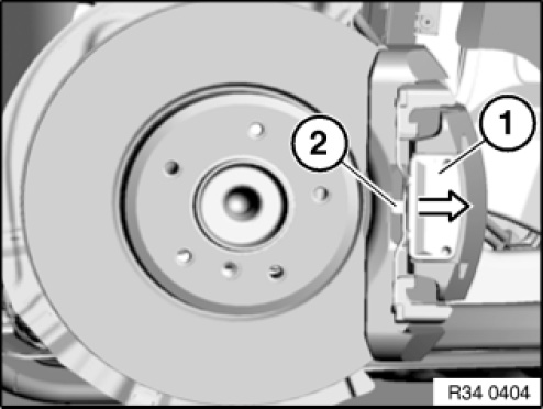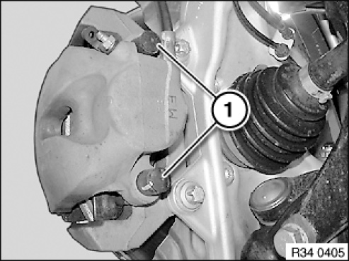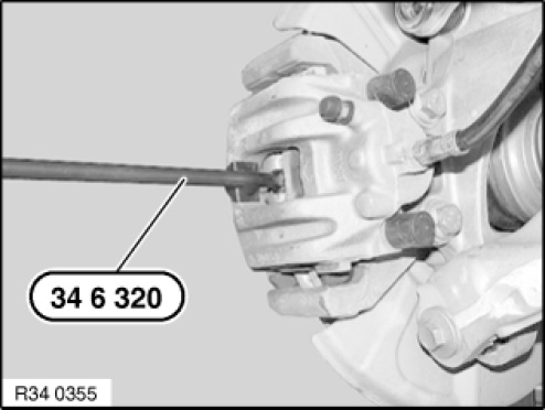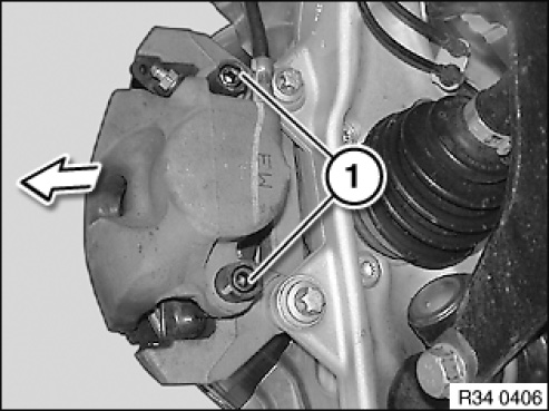 Release guide screws (2) with special tool 34 1 080. Withdraw brake calliper backwards.