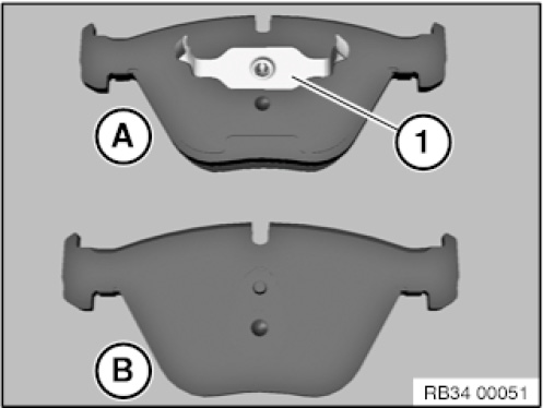 The previous version (A) with retaining spring (1) is replaced by brake pads of version (B) without retaining spring.