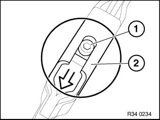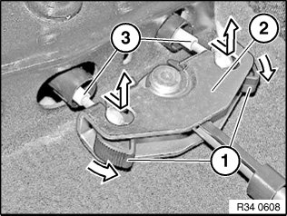 Actuate parking brake lever. Connect special tool 32 1 030. Press stop (1) of adjusting spring back to such an extent that retaining hook (2) engages in stop (1).