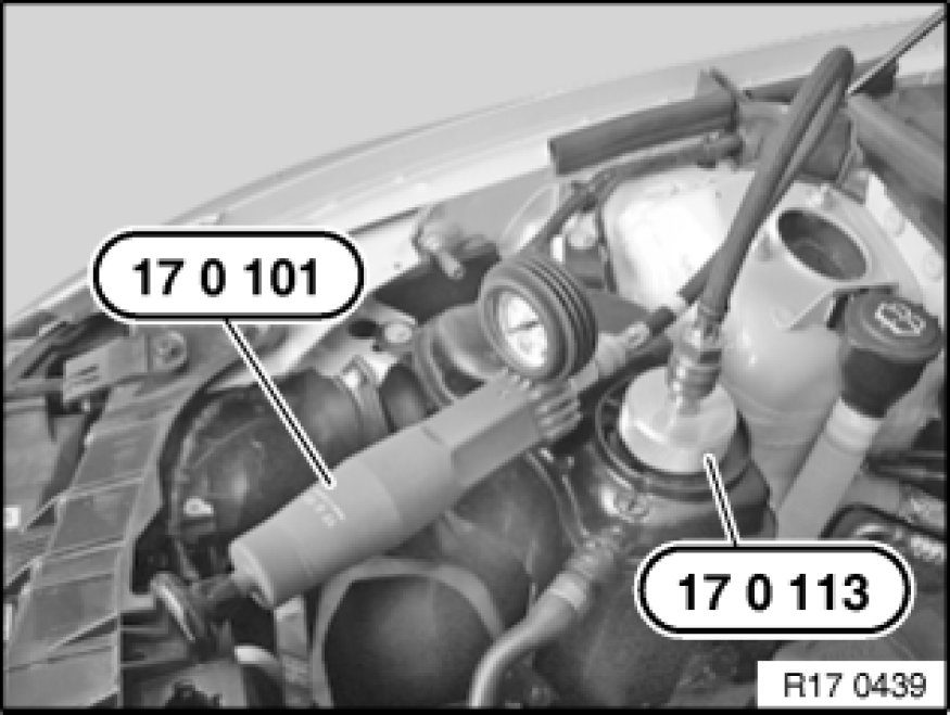 Open cap on coolant expansion tank. Fit special tools 17 0 101 17 0 100 Tester/ 17 0 113 17 0 100 Tester.