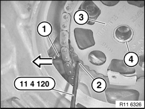Turn sprocket (3) with central bolt at crankshaft into position until special tool 11 0 290 can be secured.