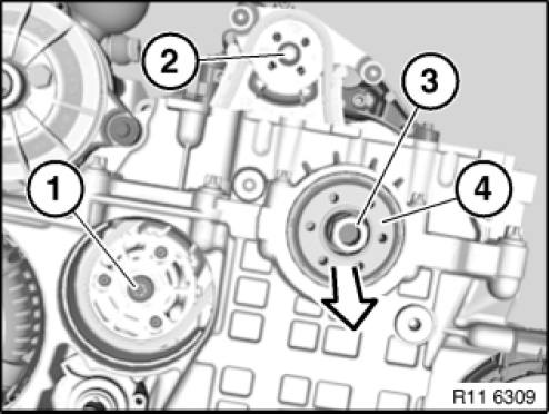 NOTE: To release bolt (1), insert a 6 mm drill bit between sprocket and oil pump housing.