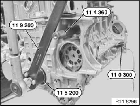 Secure crankshaft and camshaft with special tools 11 0 300 and 11 4 280 (refer to Checking timing).
