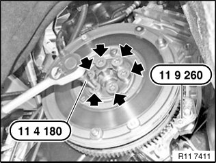 Rotate engine at central bolt and secure flywheel in position with special tool 11 0 300.