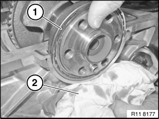 Secure flywheel with special tool (1) 11 9 260 and special tool (2) 11 9 266.