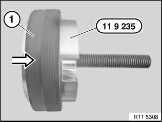 P1Push radial shaft seal (1) carefully in direction of arrow on special tool 11 9 235.