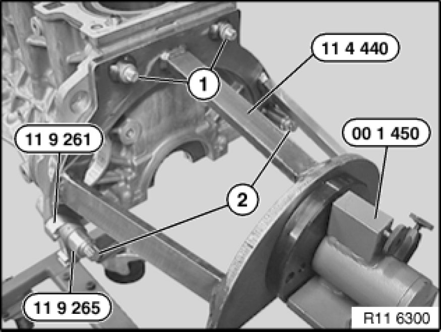 Bolt engine or engine block with steel bolts (1) and aluminium bolts (2) to special tool 11 4 440 11 4 440 Engine Support Plate.