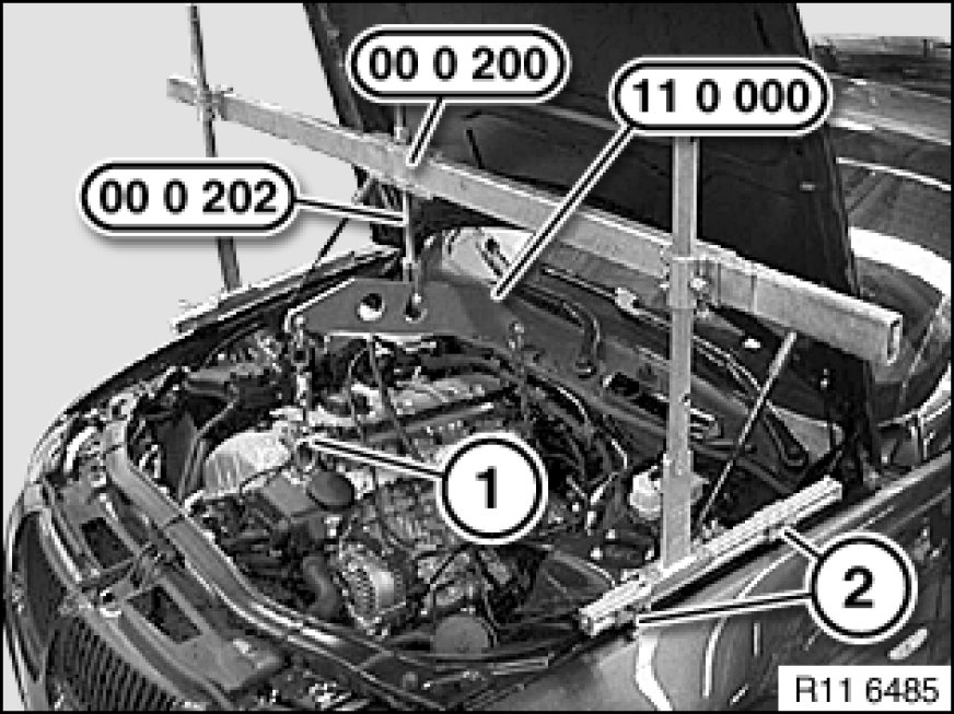 Fit suitable chains to special tool 11 0 000 and attach to towing hook (1) or engine lifting eye.