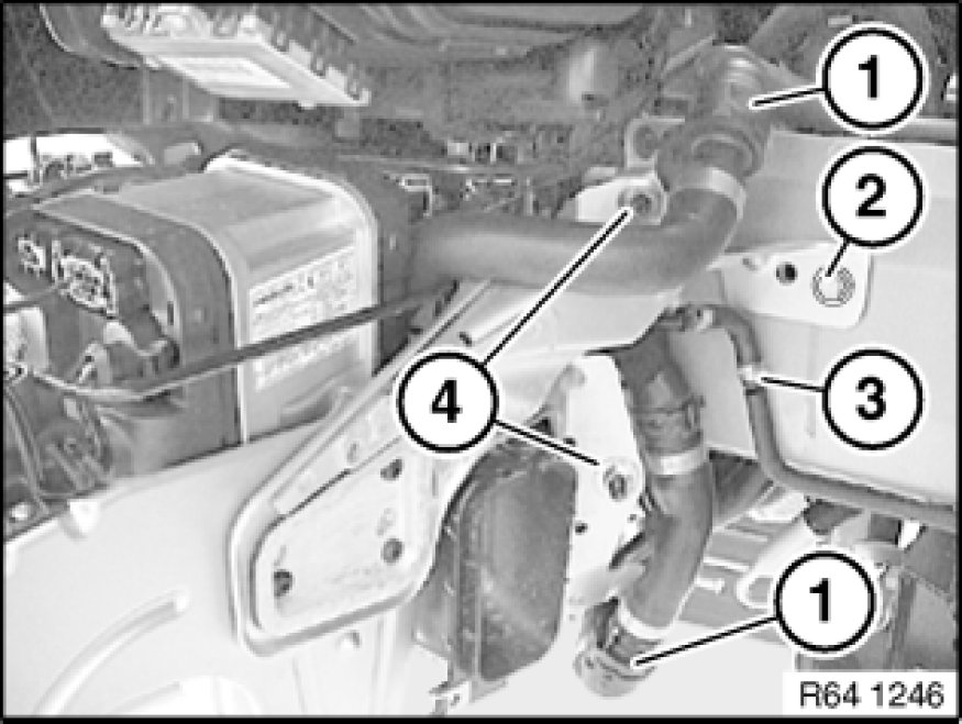 Disconnect coolant hoses (1) and catch coolant in a suitable container.