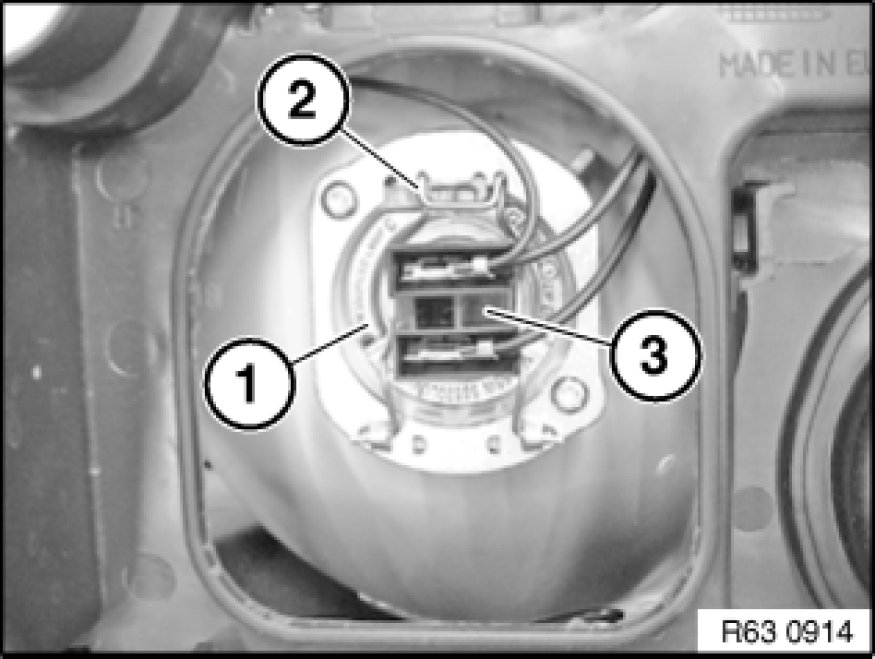 Unlock retainer (1) and remove cover (2) in direction of arrow from headlight.