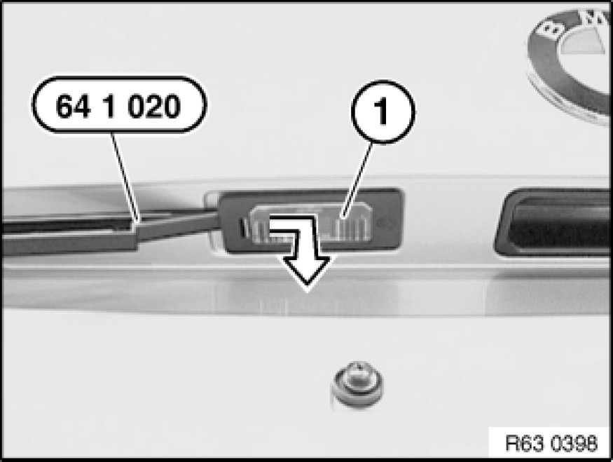 Lever number/license plate light (1) with special tool 64 1 020 in direction of arrow out of rear lid.