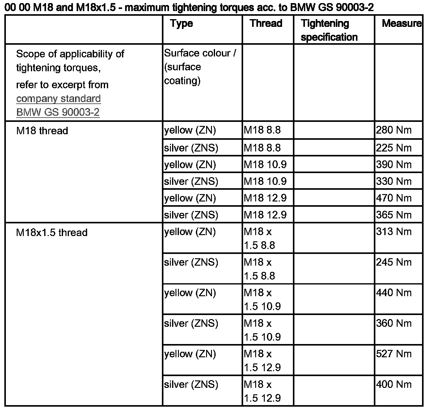 00 00 ... M18 and M18x1.5 - Maximum Tightening Torques Acc. to BMW GS 90003-2