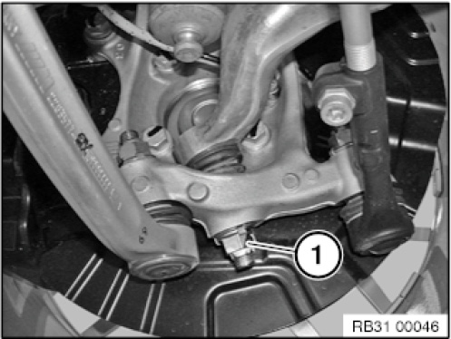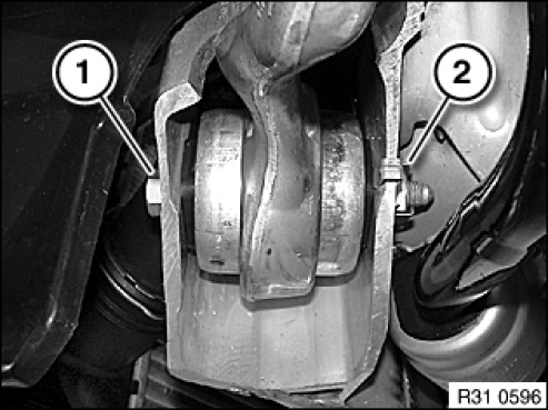 Raise locking nut (2) at area of bore and pull off from front axle support.