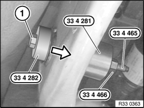 Draw in rubber mount (1) with special tools 33 4 282, 33 4 283, 33 4 284,