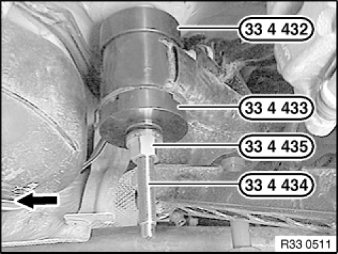 Using the special tools 33 4 436 , 33 4 437 , 33 4 140 and 33 4 431 , pull rubber mount out of bearing bush.
