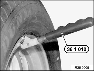 1. Gently press off tire sidewall with special tool 36 1 020 at appropriate point from rim flange.