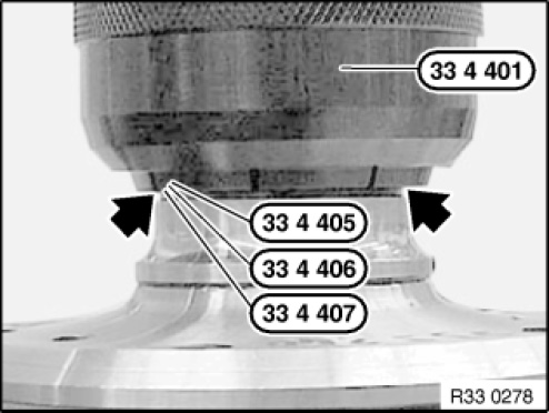Position special tool 33 4 401 with the corresponding insert on groove of wheel bearing inner ring.