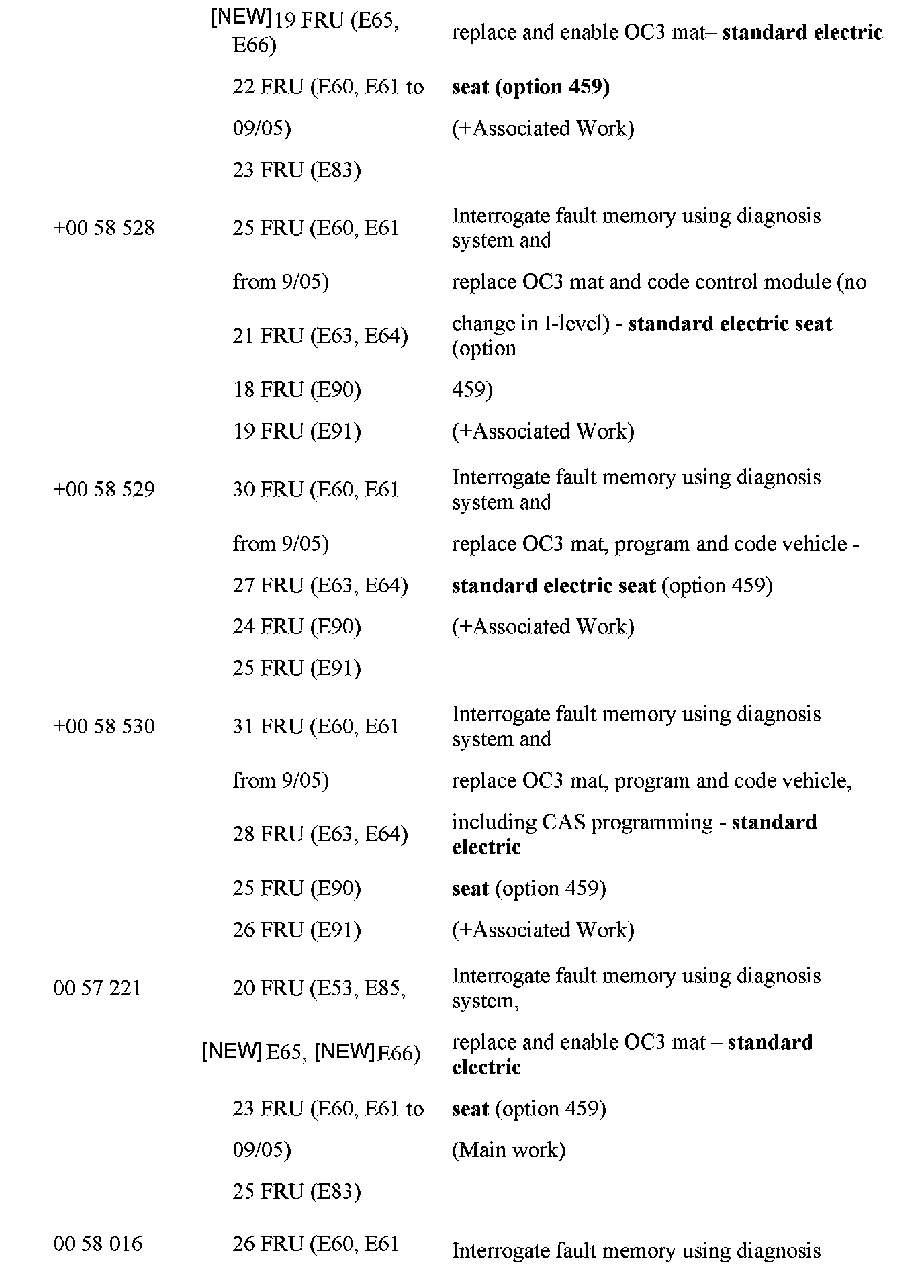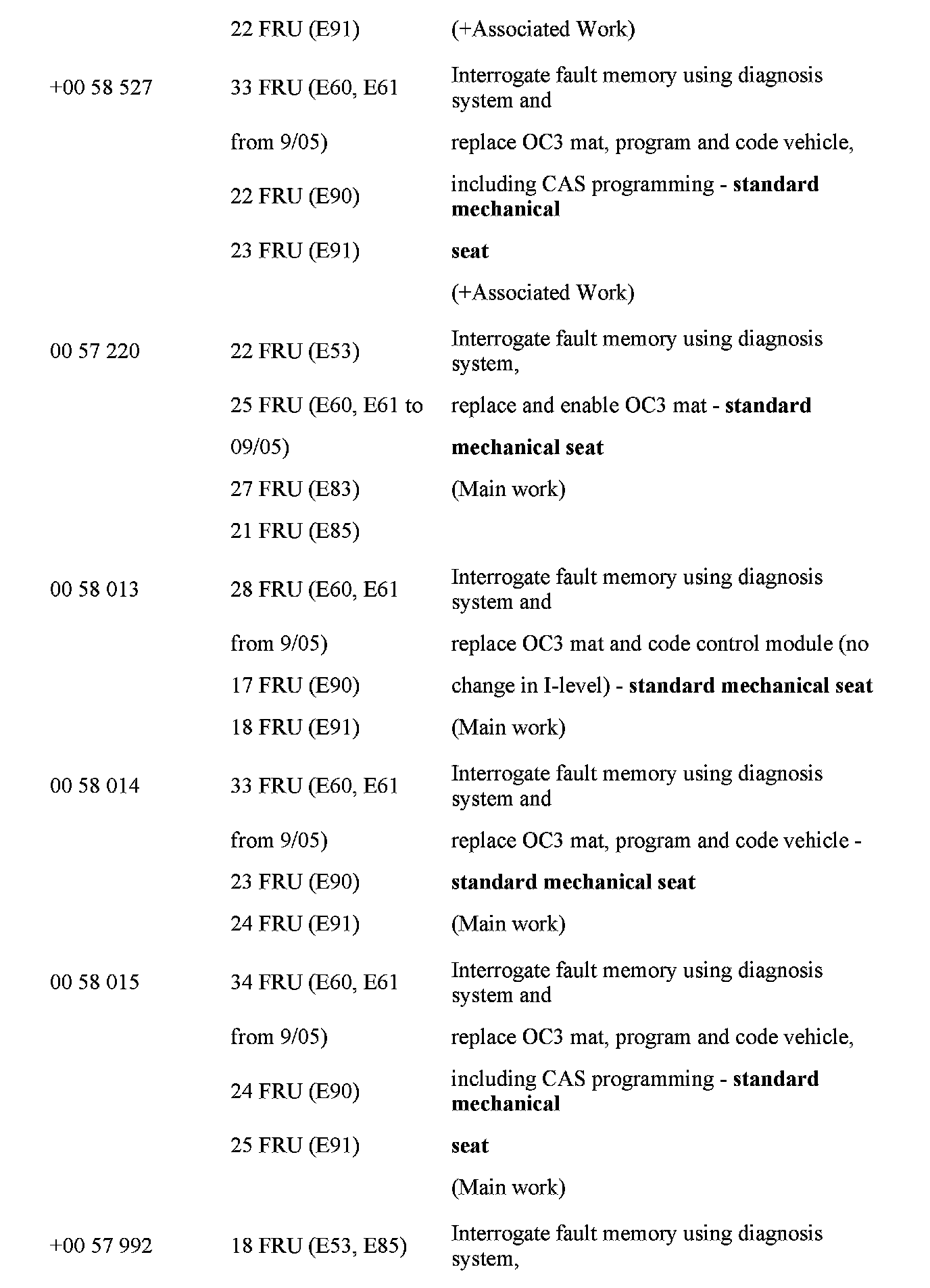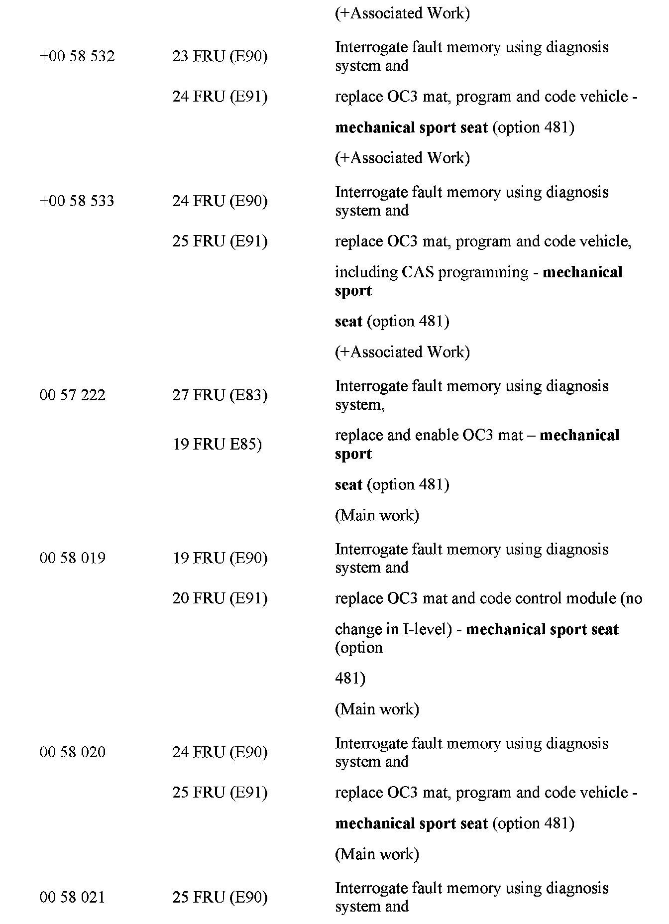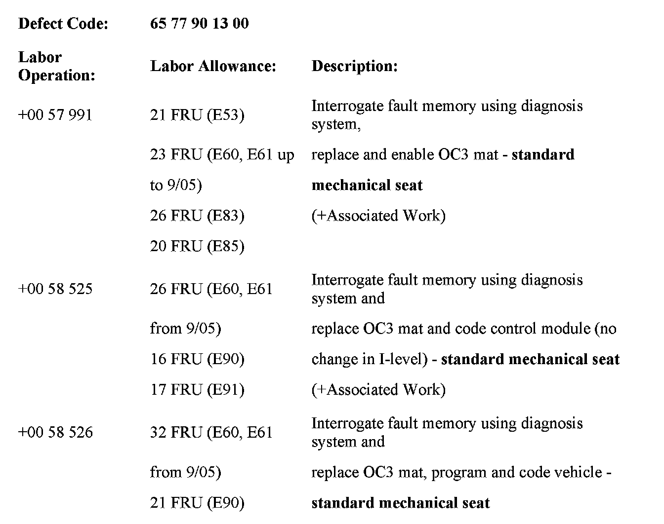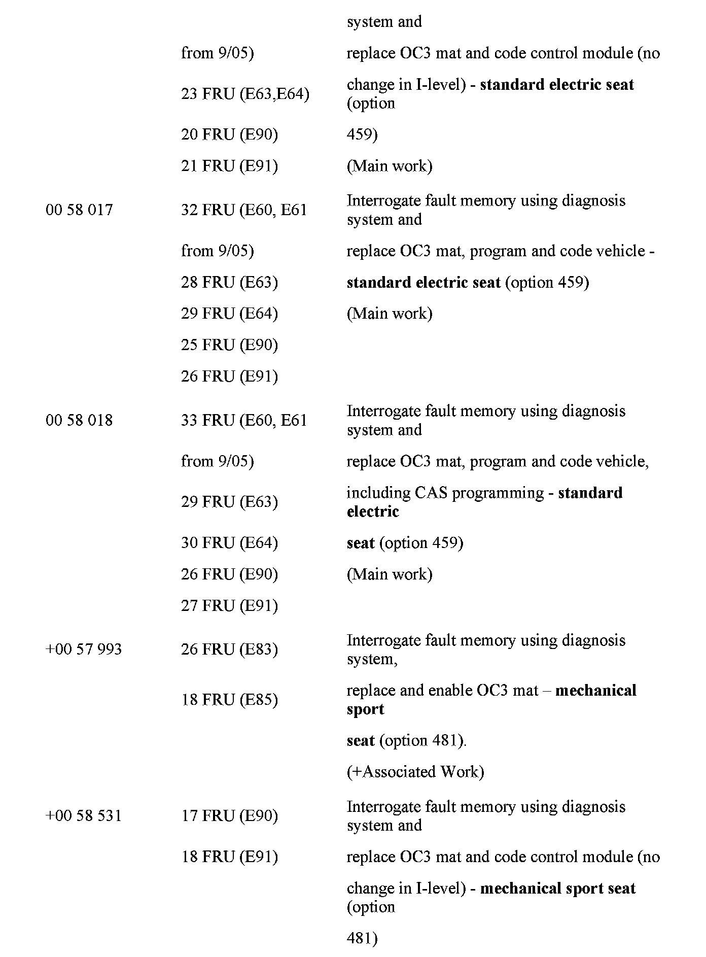 Depending on the vehicle concerned, one of the following OC3 seat mat faults is stored in the SRS Control Module/Satellite 95B8, 71, 93C3, 97E0.