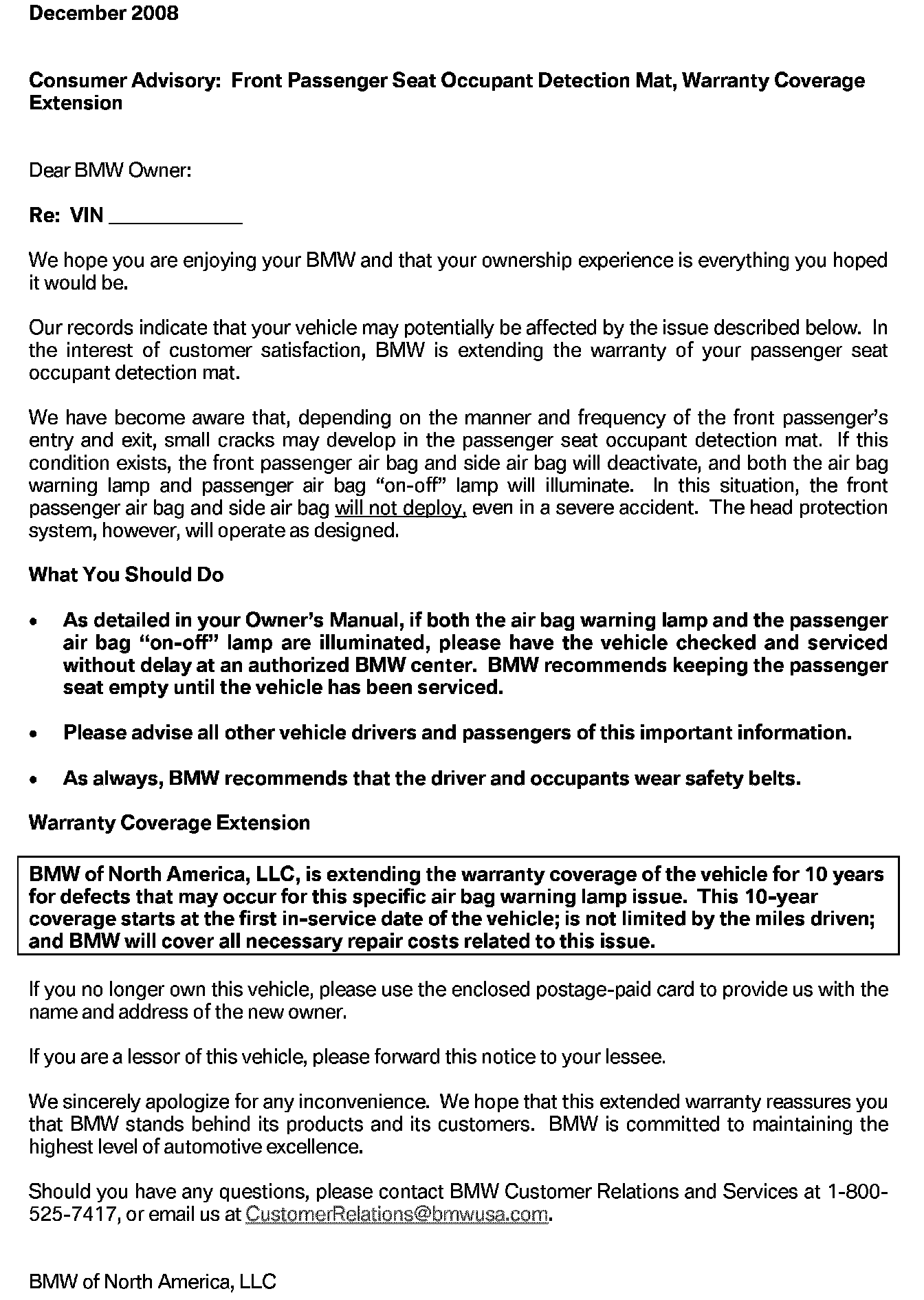 In the interest of customer satisfaction, the warranty coverage of the vehicle for this specific airbag warning lamp issue has been extended to 10 years without mileage limit. The attached letter has been sent to the owners of all affected vehicles to advise of this change. Eligible vehicles will be shown in the DCS Warranty Vehicle Enquiry (see attachment).