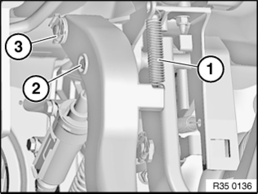 - Remove trim panel 51 45 185 Removing and Installing/Replacing Panel For Pedals for pedal assembly.