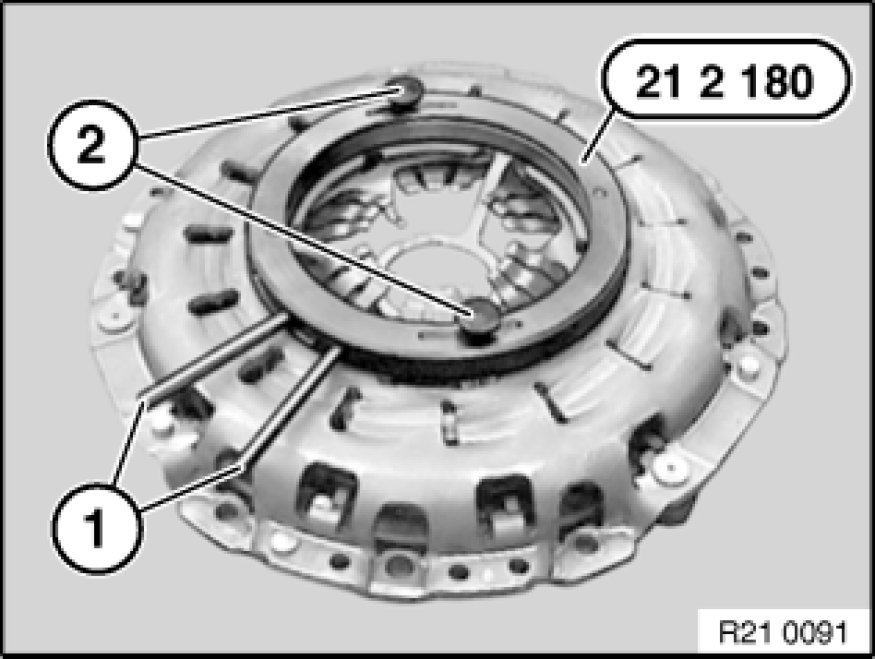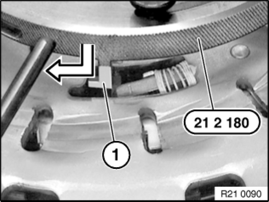 Locking hooks (1) of special tool 21 2 180 21 2 180 Locating Ring must engage in openings in SAC clutch.