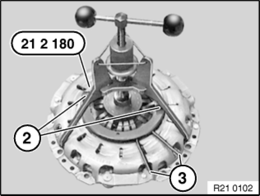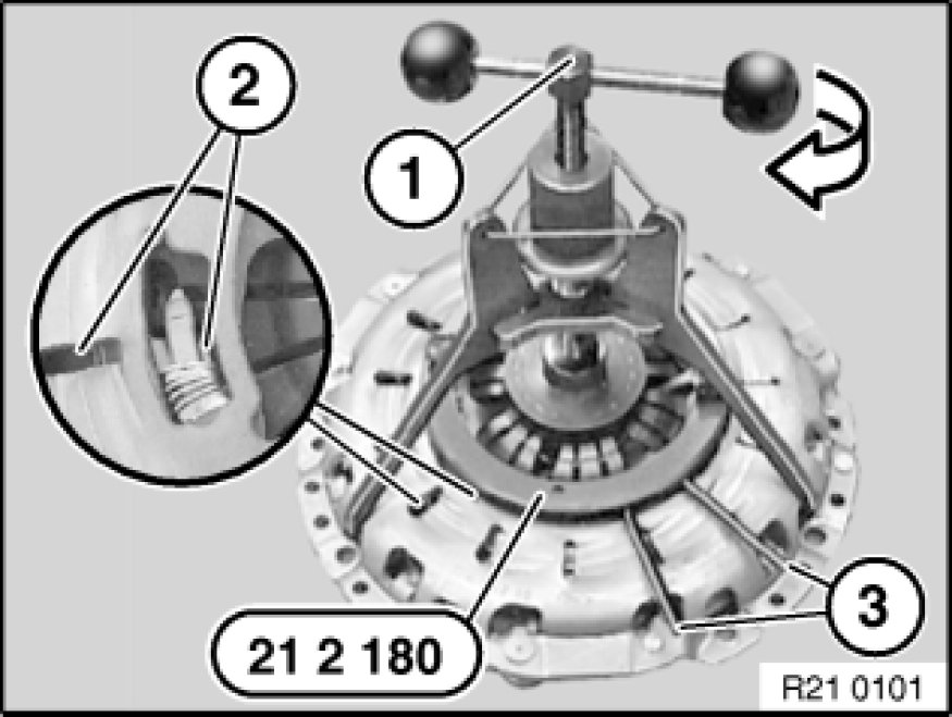 Screw in spindle (1) until adjustment ring of SAC clutch (2) can be turned with special tool 21 2 180 21 2 180 Locating Ring at handles (3).