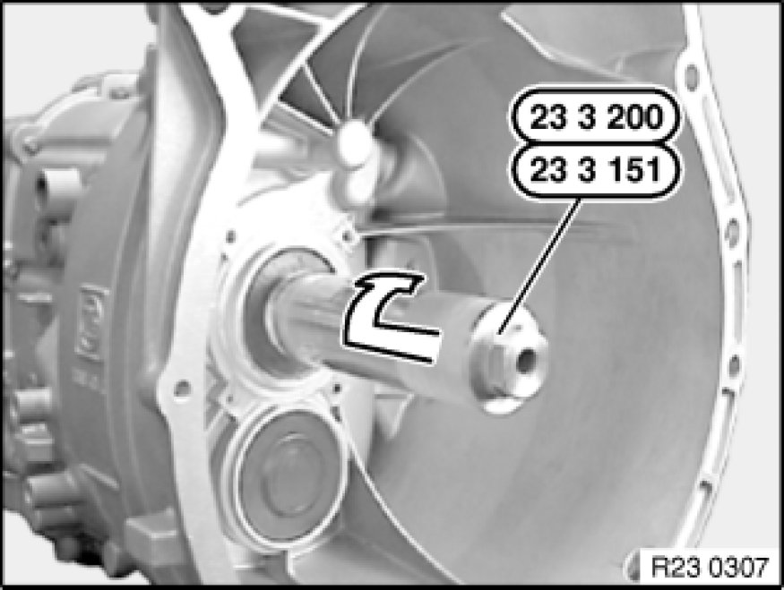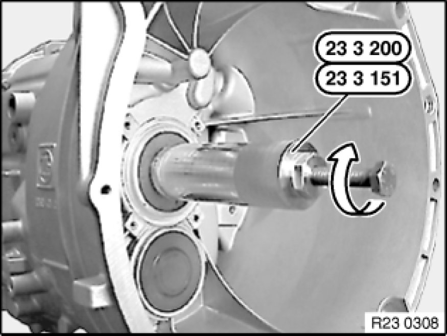 Insert screw into special tool 23 3 151 23 3 150 Set of Tools again and continue turning until sealing ring is pulled out of transmission housing.