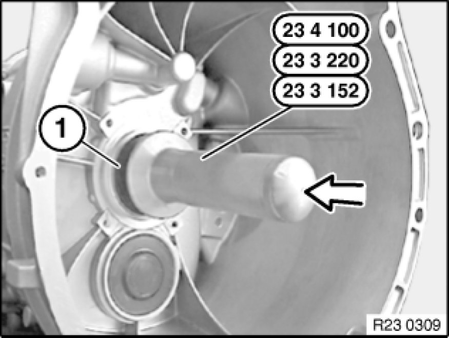 Drive in radial seal (1) as far as it will go with special tool 23 3 152 23 3 150 Set of Tools and plastic hammer.