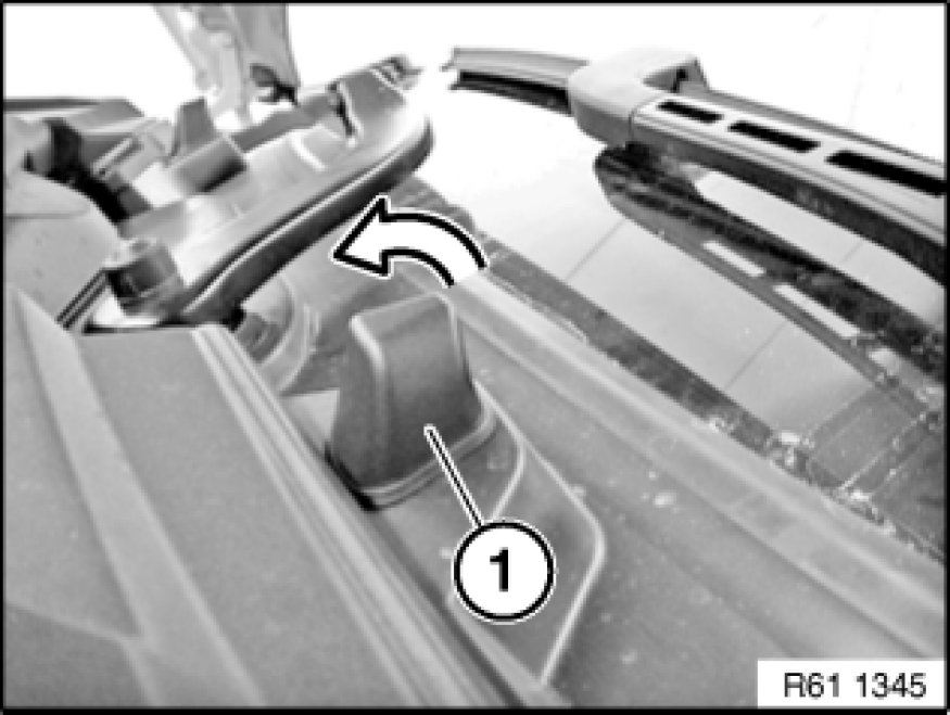 Release spray nozzle (1) in direction of arrow from cowl panel cover and remove.