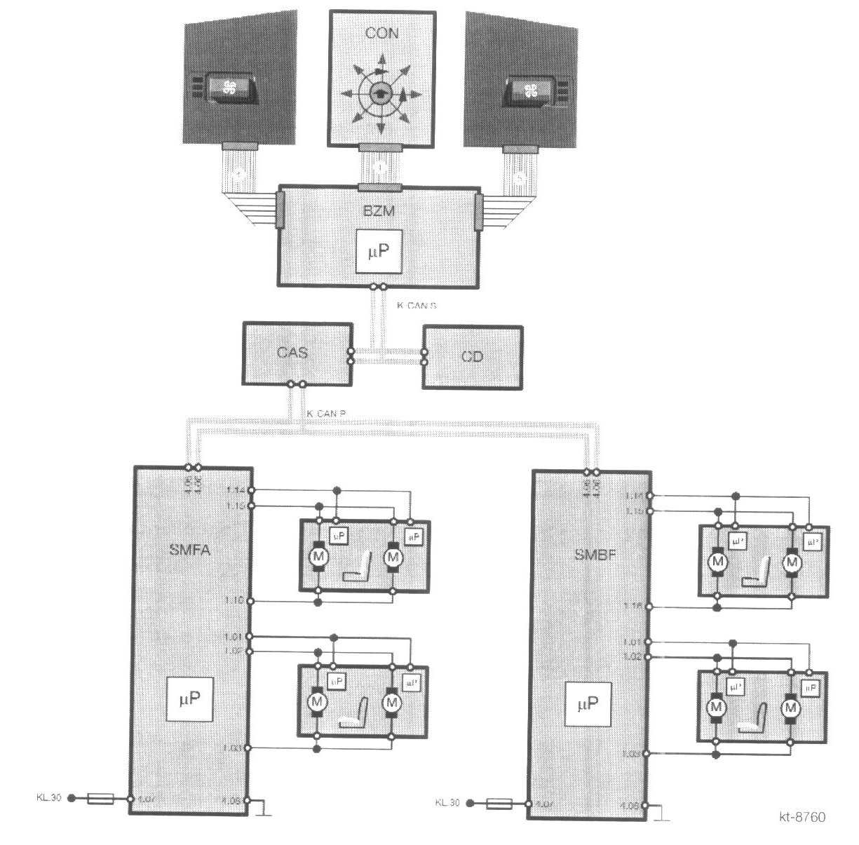 Signal path: Switch block 14-pin ribbon cable BZM K-CAN S CAS K-CAN P SMFA or SMBF.