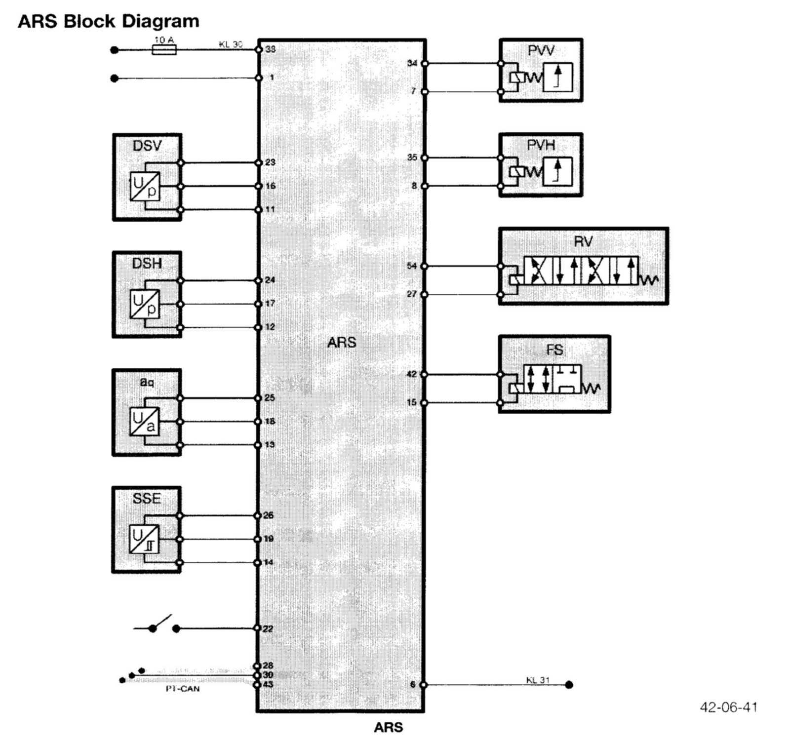 The pressure sensors provide the ARS control module with the stabilizer bar oscillating motor pressures. To direct the buildup pressure according to the corner (left hand or right hand twist), the directional valve is actuated by the control module. The SSE sensor detects the directional valve selector position.